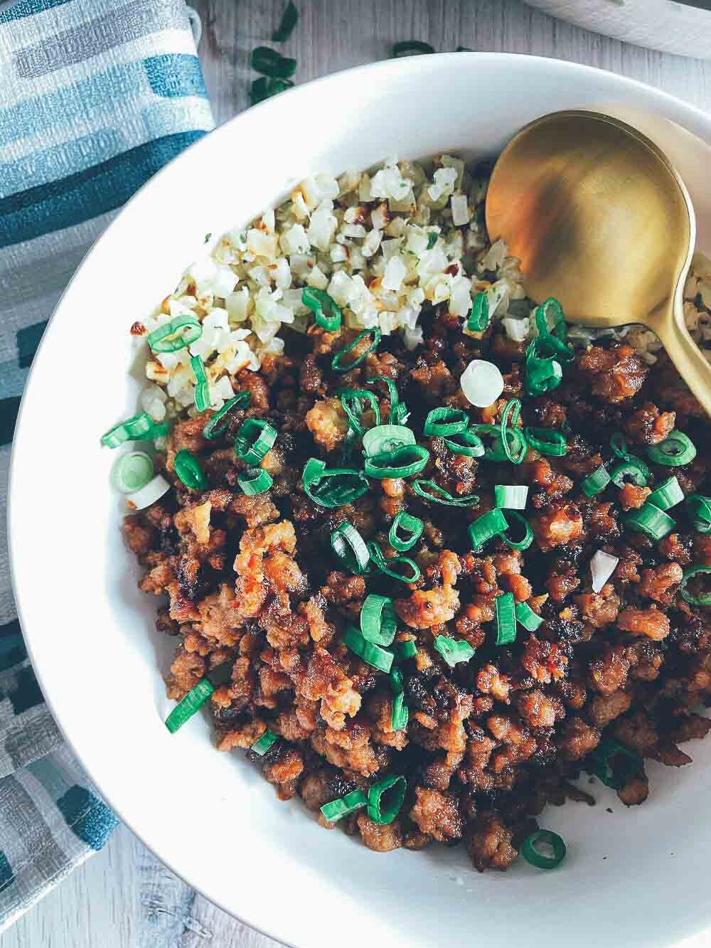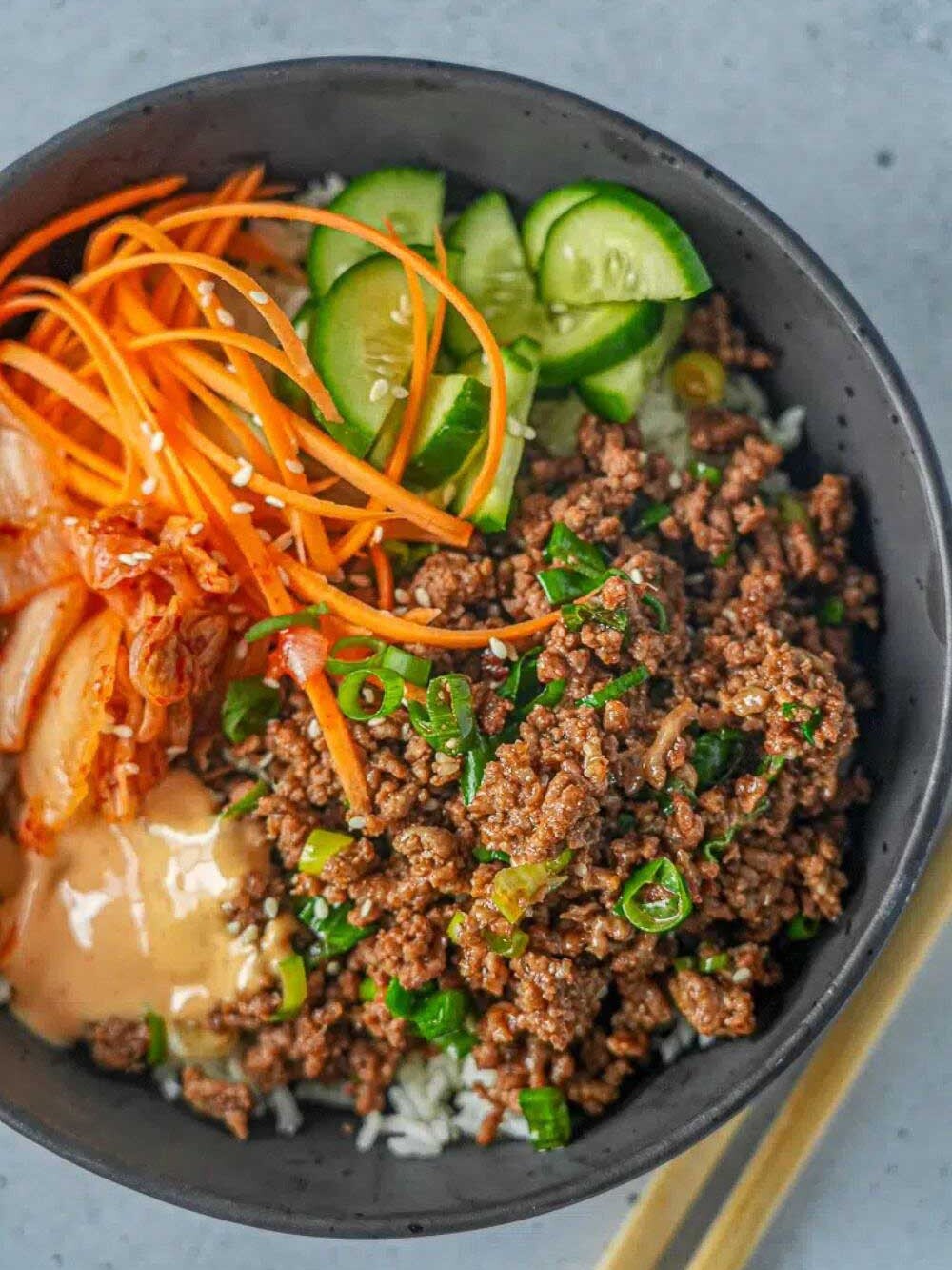 Ground beef cooks with ginger, garlic, and a lightly sweet sauce. It’s fast, comforting, and always satisfying. Add veggies on top for extra color and crunch.