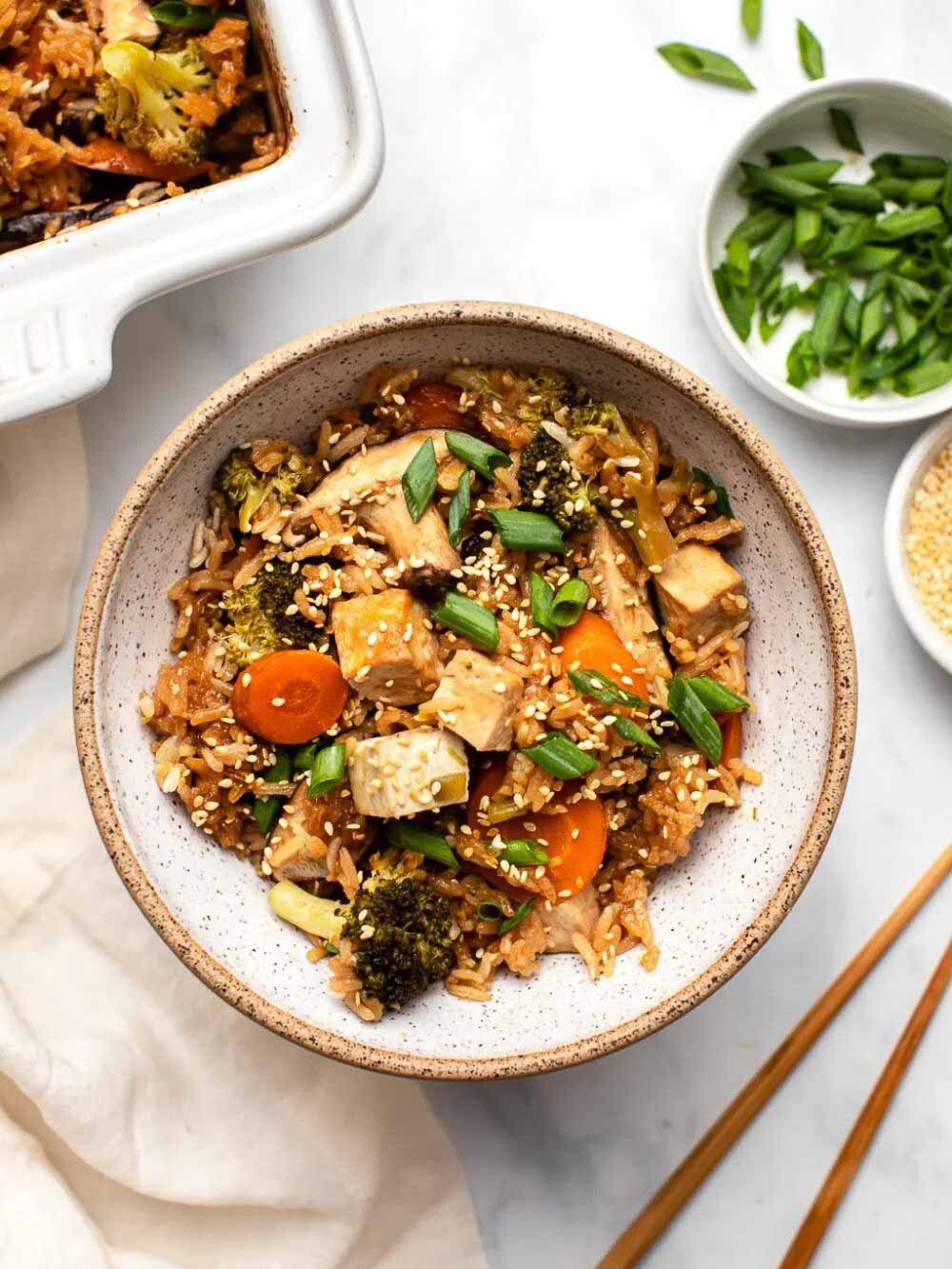 Tofu and rice bake together in a cozy, teriyaki-style sauce. The casserole format makes this a stress-free choice. It’s especially helpful for make-ahead meals.
