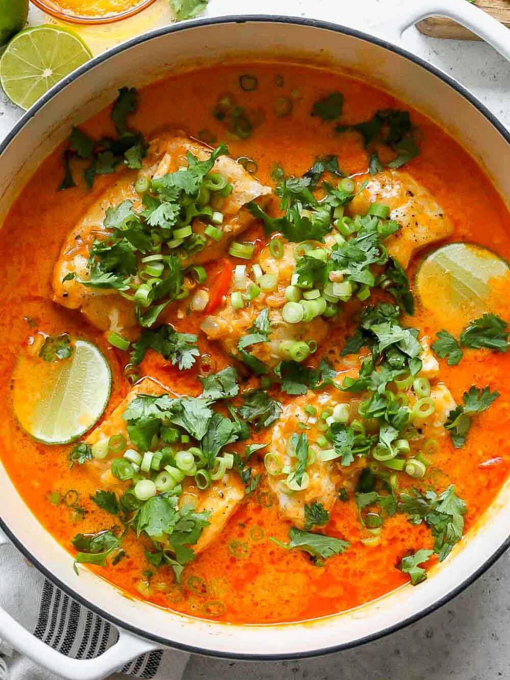 Cod simmers gently in a creamy coconut broth that layers chili, lime, and aromatics, making it another great fit for high protein asian recipes. The flavors stay light but satisfying. It works well when you want something soothing and bright.